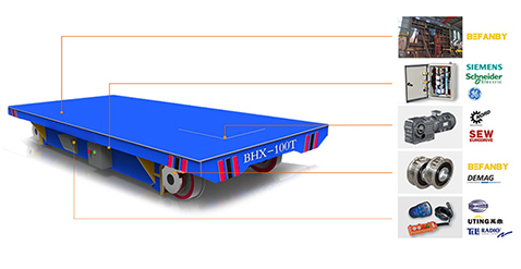 BHX:采用滑觸線將380V交流電源引入平車作為該平車的電力來源,其運(yùn)行頻率和使用時(shí)間不受束縛,適用于較長距離運(yùn)輸?shù)膱龊?。滑觸線安裝平車底部或兩側(cè),會對其他車輛的過往造成影響,但因其臺面較低,卻是流水線生產(chǎn)的 輸送設(shè)備。