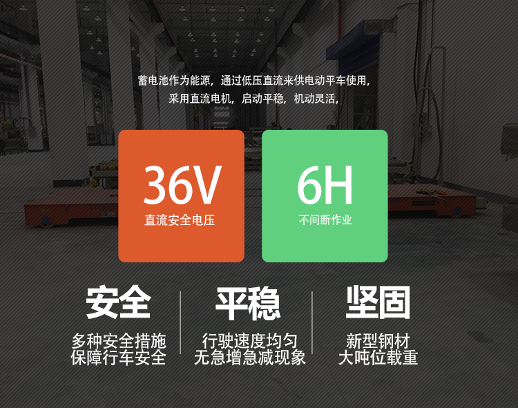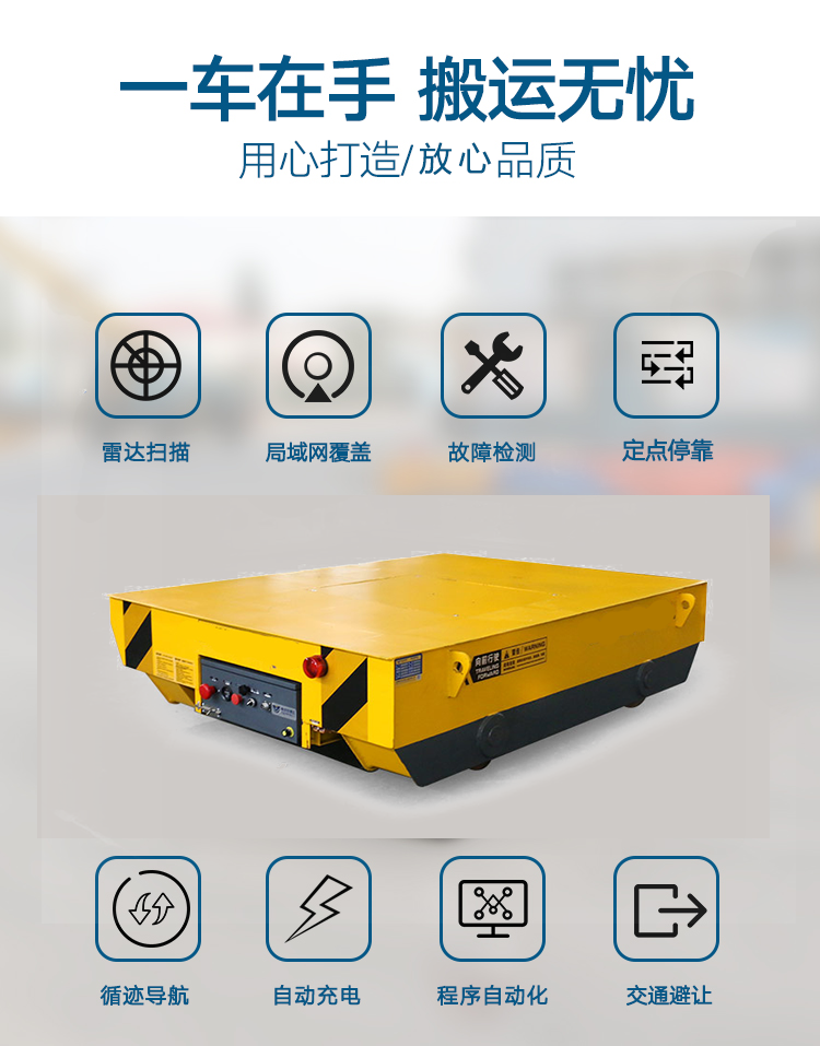 RGV:自動化軌道平車是一種以蓄電池作為電源,電機減速機作為驅(qū)動系統(tǒng),鑄鋼車輪直接在軌道行走的轉(zhuǎn)運車,其運行不受限制,可以根據(jù)需求自動化對位,輥輪傳送,頂升,臺面旋轉(zhuǎn)等功能,載重能力1-200噸