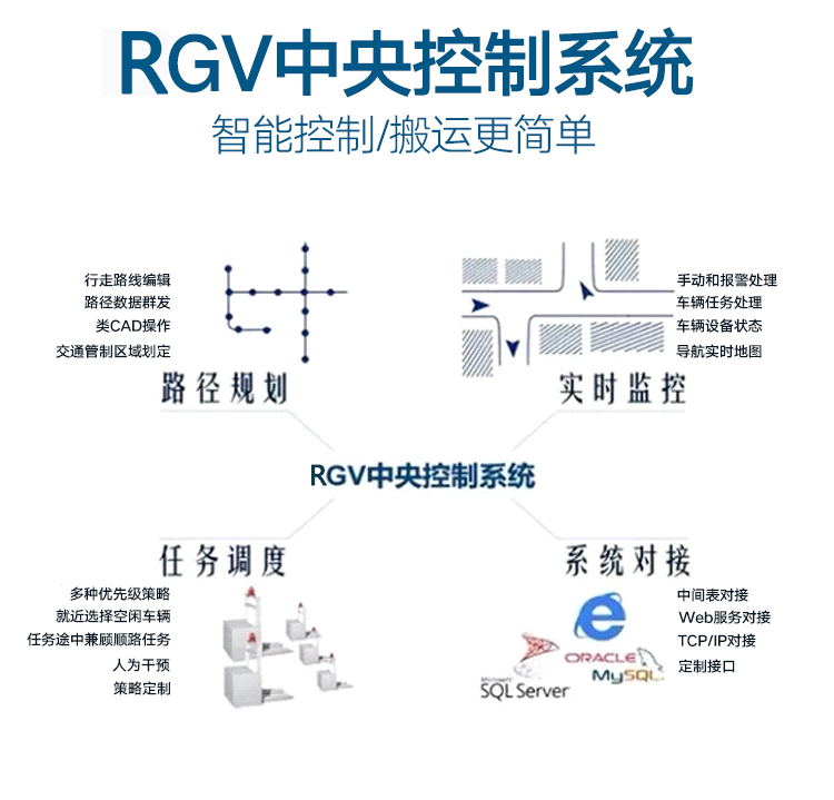 RGV屬于是有軌制導(dǎo)車輛,運行路線上有導(dǎo)軌的引導(dǎo),全程有自動化電器控制,可以滿足高精度的對接。由于有軌道的限制,RGV沒有自動導(dǎo)引搬運車AGV的靈活性好,智能程度高。