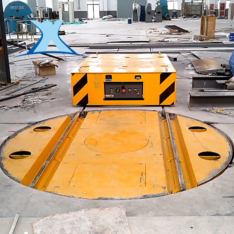 實(shí)現(xiàn)軌道平車原地轉(zhuǎn)彎換向的設(shè)備,安裝在兩條軌道交叉的位置,其臺(tái)面上鋪設(shè)一條或多條軌道,軌道上表面與地面上的軌道上表面平齊,軌距與地面的軌距一致,平車完全運(yùn)行至轉(zhuǎn)盤上停止,轉(zhuǎn)盤啟動(dòng)轉(zhuǎn)動(dòng)至需要的角度與地面的軌道完成對(duì)接,平車再次啟動(dòng)沿對(duì)接后的軌道運(yùn)行至需要的位置。其特殊的功能是軌道運(yùn)輸系統(tǒng)中常見的設(shè)備。臺(tái)車自重加載重就是配套轉(zhuǎn)盤的載重量,轉(zhuǎn)盤的旋轉(zhuǎn)角度可根據(jù)客戶的不同需求設(shè)定,可實(shí)現(xiàn)360度任何一個(gè)角度停止,也可實(shí)現(xiàn)井型十字交叉運(yùn)行。